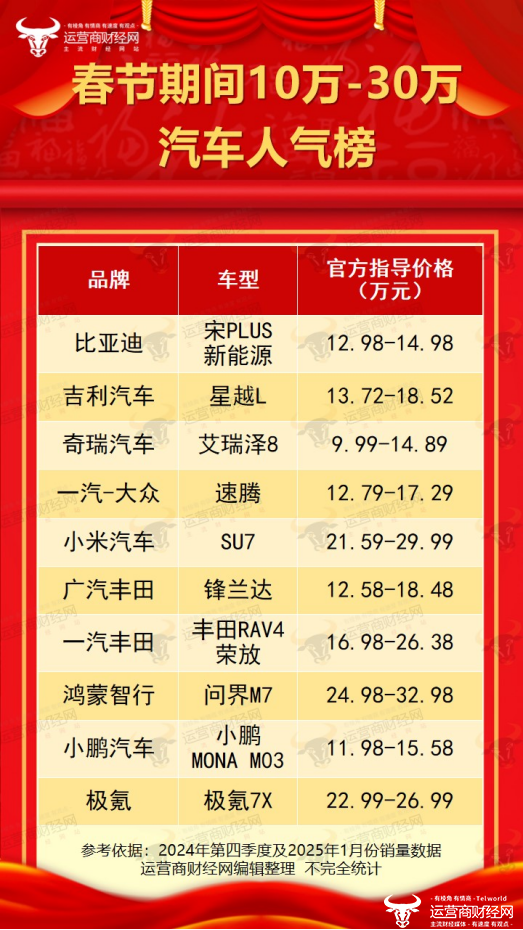 日前,国内主流财经、科技、汽车资讯网站——运营商财经网正式推出“春节期间10万-30万汽车人气榜”,在这一价位区间,都有哪些车型光荣上榜?接下来运营商财经网将逐一揭晓。