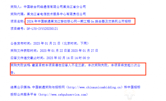 招标公告发布不到一周,1月27日黑龙江联通就发布了“招标失败”公告。原因是:项目潜在应答人不足三家。在同一天,黑龙江联通又发布了“公开招标(二次)公告”