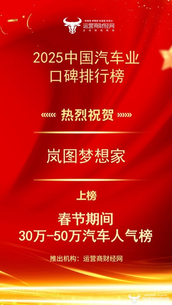 作为汽车行业的敏锐洞察者,运营商财经网独家打造了“2025中国汽车业口碑排行榜”系列榜单,至少覆盖三大领域,即杰出高管、车型人气以及传播力。日前,该系列榜单之一——“春节期间30万-50万汽车人气榜”正式对外公布名单,岚图梦想家成功上榜!