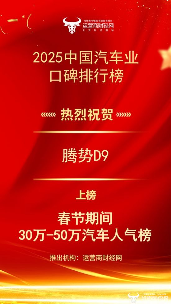日前,运营商财经网正式公布了“春节期间30万-50万汽车人气榜”名单,共有十款车型登上该榜单,都是颇受大众关注和喜爱的热门车型。其中,腾势D9榜上有名!