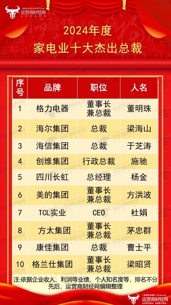 近日,运营商财经网倾力打造的“2024年度家电业十大杰出总裁”名单公布。究竟是哪些家电企业的总裁榜上有名?下面,运营商财经网将正式揭晓。