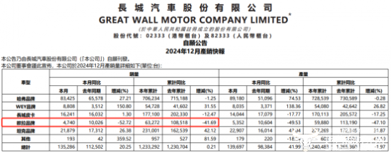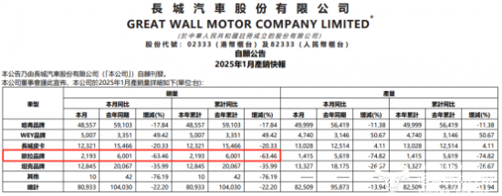 不过,由于最近几年欧拉的市场表现并不尽如人意,因此赵永坡未来面临的压力应该不小。产销快报数据显示,2024年全年,欧拉品牌的销量为63272辆,同比下降41.69%,是长城汽车旗下所有品牌中降幅最大的。进入2025年,其销量下滑态势仍在持续,1月份的销量只有2193辆,同比降幅高达63.46%。