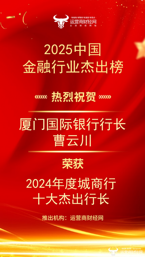 日前,国内主流财经、科技、汽车资讯网站运营商财经网正式推出了“2025中国金融行业杰出榜”系列榜单的其中之一——“2024年度城商行十大杰出行长”榜单。其中,厦门国际银行行长曹云川成功上榜该榜单。