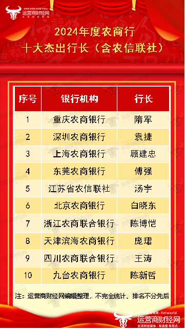近日,由运营商财经网推出的“2024年度农商行十大杰出行长(含农信联社)”名单正式公布,最终选定了十位上榜人选,下面将逐一揭晓。