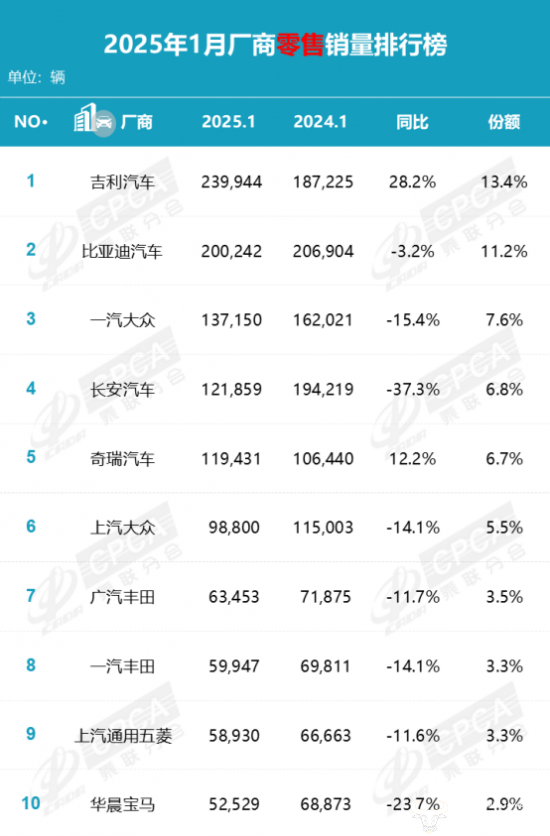 近日,乘联会发布了2025年1月零售销量排名快报,引发关注。运营商财经网注意到,本月只有吉利汽车和奇瑞汽车实现了同比增长,其余上榜的厂商均出现不同程度的下滑,接下来运营商财经网将揭秘具体情况。