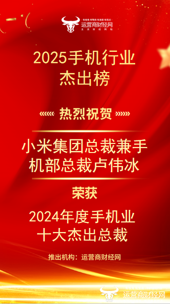 2025年开年不久,运营商财经网又有大动作!此次,“2024年度手机业十大杰出总裁”榜已经出炉,小米集团总裁兼手机部总裁卢伟冰珠榜上有名,恭喜他!