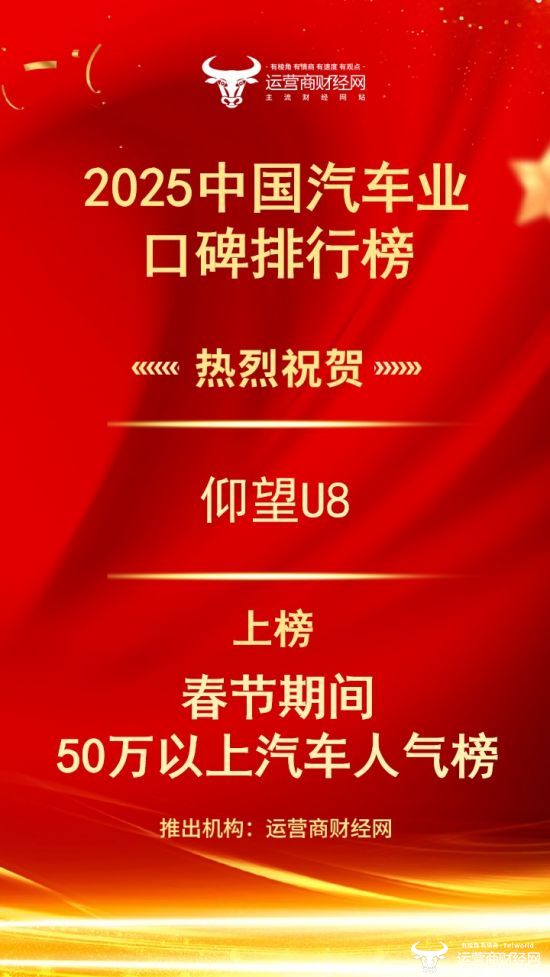作为比亚迪旗下的百万豪车,仰望U8自正式上市以来便颇受消费者青睐,市场反响热烈。同时,这款车型也是中国品牌在高端豪华市场上的突破。凭着出色的市场表现,仰望U8成功上榜“春节期间50万以上汽车人气榜”,热烈祝贺!