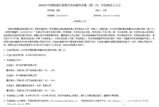 近日,中国联通采购网发布“2025年中国联通甘肃集中优化服务采购(第二次)中选候选人公示”。从现有信息来看,项目规模不算大,却吸引了包括华为、中兴、诺基亚在内的多家知名厂商前来投标。具体是什么情况呢?