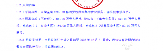 据了解,2025年1月1日,甘肃联通第一次发布比选公告。项目采购内容为全省LTE、NR移动无线网络集中优化服务,划分为3个标段,预算金额不高,不含税400万元人民币。其中,比选包1(华为业务区)159万元,比选包2(中兴业务区)159万元,比选包3(诺基亚业务区)82万元。不接受联合体应答。
