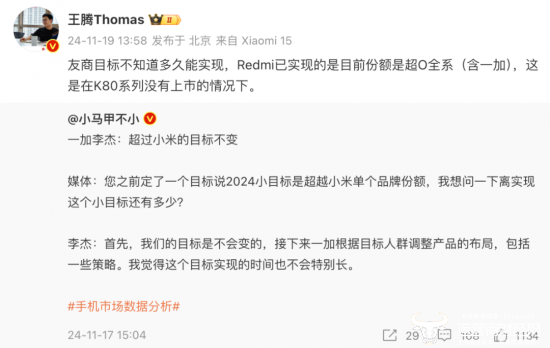 此外,小米方面还对李杰的目标作出回应,小米中国区市场部副总经理、Redmi品牌总经理王腾称:“友商目标不知道多久能实现,Redmi已实现的是目前份额是超O全系(含一加),这是在K80系列没有上市的情况下。”