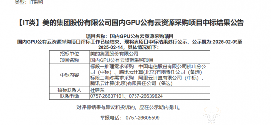 据美的集团在2月9日发布的中标结果公告显示,该项目标段一推理需求采购的中标人为佛山电信,而腾讯云计算(北京)有限责任公司是备选;