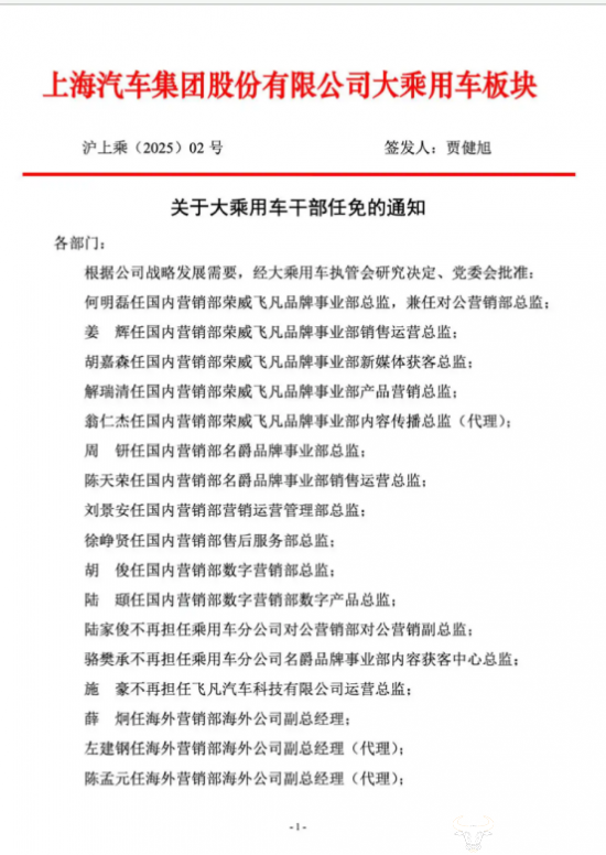 日前,一份名为《关于大乘用车干部任免的通知》的文件在网上广泛流传,文件内容则是上汽荣威、飞凡品牌和名爵品牌的干部任免名单,引发业内关注。同时,这份文件也得到了上汽乘用车相关负责人的证实,接下来运营商财经网将试图揭秘具体情况。