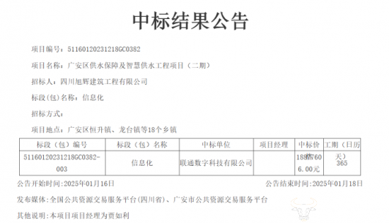 先来了解一下项目的具体情况。据悉,早在去年11月29日,四川广安市下属的广安区供水保障及智慧供水工程项目(二期)(项目名称)设备采购信息化标段招标公告就已经发布。