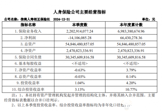 另外,据信美人寿公布的2024年第四季度偿付能力报告显示,2024年信美人寿保险业务收入约为69.83亿元,与上年同期的90.84亿元,缩减了21.01亿元,同比降幅达23.13%;但是其2024年净利润约为0.66亿元,与上年同期的0.57亿元相比有所增长。