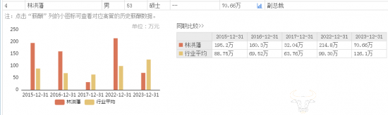 此外,根据东方财富网显示,林洪藩2023年的薪酬为70.66万,与另一位副总裁杨波持平。但与上一年的年薪214.8万元相比,下滑较多,下滑了144.14万元。
