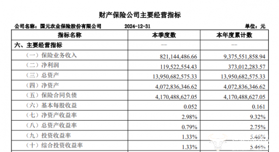值得一提的是,据国元农险公布的2024年第四季度偿付能力报告显示,公司在2024年累计保险业务收入约为93.76亿元,由上年同期的96.94亿元相比微降;但是,公司2024年的累计净利润约为3.73亿元,与上年同期的3.55亿元相比微增。
