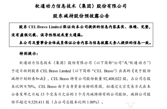 值得一提的是,软通动力二股东CEL Bravo因自身资金安排计划在2024年12月3日至2025年3月2日期间减持最多952.9411万股,占总股本的1%。