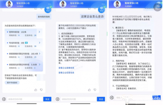 “过去,我们进行客户拜访时,需要事先在系统不同地方查找资料并整理打印。现在通过ChatCRM可以方便查到完整的企业情况,还可以了解到企业招投标、收入经营等信息。此外,我还能通过Chat CRM得到企业的走访建议,针对性的做好成员纳管、业务拓展攻略,从而能更好的维系和发展客户。”浙江移动客户经理小张说。目前,ChatCRM还能提供产品、解决方案的功能说明和问题解答,帮助一线更好的和客户进行产品的推介营销,有效推动业务拓展。