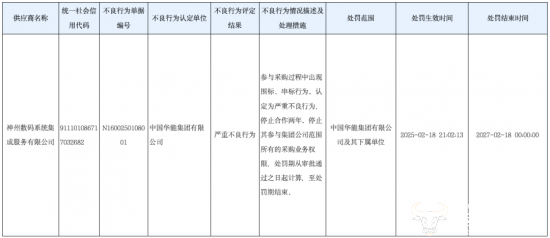 据悉,在2月20日,中国华能集团有限公司发布了一则《关于神州数码系统集成服务有限公司供应商不良行为处理的公告》。
