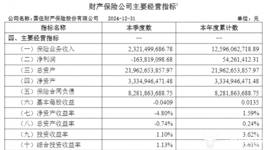 但是,据国任财险公布的2024年第四季度偿付能力报告显示,公司在2024年累计净利润为0.54亿元,与上年相比降幅较大。通过比较发现,国任财险第四季度出现了巨额亏损,净亏损金额约为1.64亿元,这一季度的亏损拉低了全年的净利润。