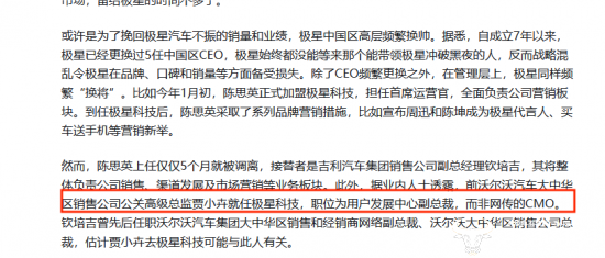 不过需要注意的是,网上一篇名为“亏损、裁员、销量下滑,极星正在溃败中国市场!”的文章爆料,贾小卉在极星科技任职期间职位是用户发展中心副总裁,而非CMO。暂不清楚文章信源是否属实。