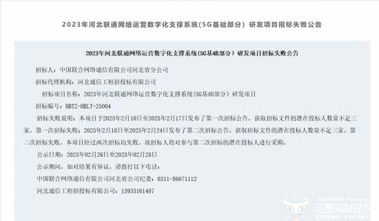 日前,中国联通发布“2023年河北联通网络运营数字化支撑系统(5G基础部分)研发项目招标失败公告”。这是什么情况?