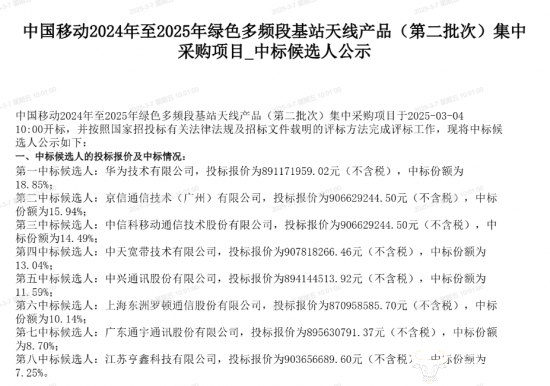 项目全称为“中国移动2024年至2025年绿色多频段基站天线产品(第二批次)集中采购项目”,不接受联合体投标,不接受代理商投标。1月20日发布了招标公告,3月6日发布了中标候选人名单,招标时间不算很长,过程较为顺利。