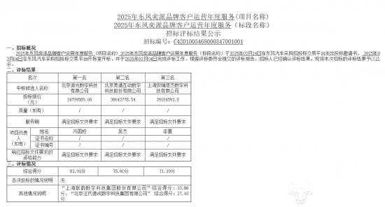 日前,东风汽车发布“2025年东风奕派品牌客户运营年度服务”招标评标结果。据了解,本次项目规模不小,金额达到数千万元。哪些厂商成功共中标?