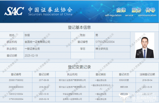 通过在中政协从业人员信息公示中搜索发现,张煜的学历很高,拥有博士研究生学历。此外,张煜具有较丰富的证券行业经验。他于2017年进入银河金汇证券资产管理公司任职,后于2021年10月离职后就加入华金证券工作。在华金证券任职期间,张煜成为该公司的副总裁,分管自营业务。直至2025年2月,张煜正式成为金圆统一证券的一员,并于2月17日开始担任公司总裁一职。