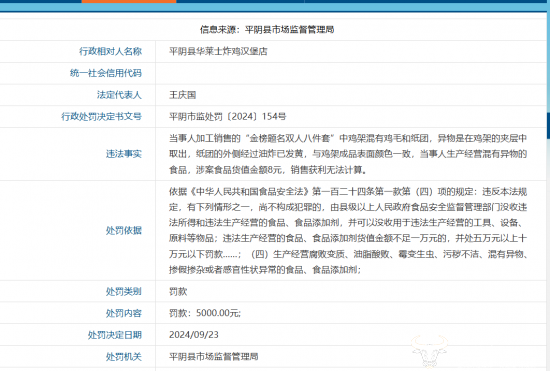 据悉,在去年9月23日,平阴县华莱士炸鸡汉堡店因生产经营混有异物的食品,被平阴县市场监督管理局罚款5千元。