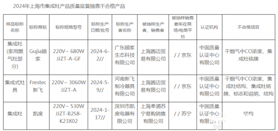 此次主要抽查了25批次产品,涉及3批次不合格。其中包括标称广东顾家生态科技有限公司生产的商标为“Gujia顾家”的一批次集成灶、标称河南新飞制冷器具有限公司生产的商标为“Frestec新飞”的一批次集成式灶具,以及标称上海奉浦苏宁易购销售有限公司生产的商标为“凯度”的一批次集成灶。