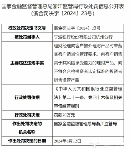 具体来看,2024年8月12日,宁波银行杭州分行因“理财经理向客户推介理财产品时未落实客户适当性管理要求,向客户销售高于其风险承受能力的理财产品;向不符合合格投资者认定标准的投资者销售资管产品”两项违法违规行为被浙江监管局罚款70万元。