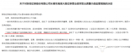通过吉林证监局在2024年9月24日发布的监管决定显示,财信证券长春东南湖大路证券营业部因存在“未有效落实从业人员投资行为管理要求;未有效履行账户使用实名制、适当性管理、异常交易管理等职责;在个别基金产品的销售过程中,未以显著、清晰的方式向投资人揭示风险”三项问题收到警示函。