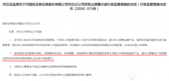 据河北证监局于2024年5月21日发布的关于对国投证券河北分公司采取出具警示函行政监管措施的决定显示,该分公司存在四项问题: