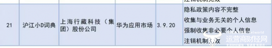 根据通报的内容,来源于华为应用市场的《沪江小D词典》(3.9.20)被查出4项问题,包含隐私政策不完整、收集与业务无关的个人信息、强制收集非必要个人信息以及注销机制无效。