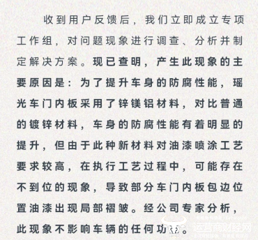 2024年5月17日,星途营销中心发布了《关于星途瑶光用户漆面投诉问题的声明》。经查明,为了提升车身的防腐性能,星途瑶光车门内板采用了锌镁铝材料。该材料对比普通的镀锌材料,能明显提升车身的防腐性能。但由于新材料对油漆喷涂工艺的要求较高,因此在执行工艺过程中可能存在不到位的情况,导致部分车门内板包边位置油漆出现局部褶皱。