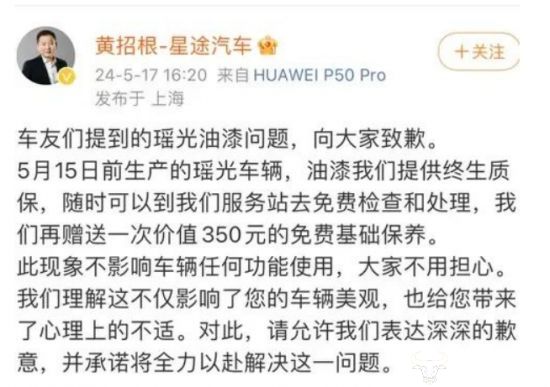 为切实解决这一问题,星途汽车承诺将对此现象提供终身质保服务。2024年5月15日之前生产的瑶光用户另外赠送价值350元人民币的免费基础保养一次。此外,星途营销中心总经理黄招根还在自己的社媒账号发布了致歉信。展现了星途汽车迅速响应用户诉求、解决用户问题的积极态度。所以,此事也就此平息。