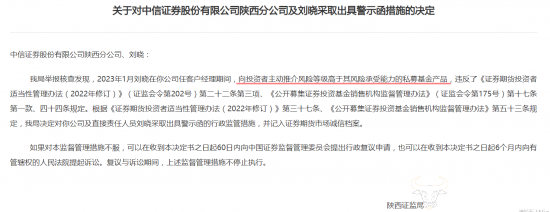 2024年9月14日,陕西监管局发布关于对中信证券陕西分公司及刘晓采取出具警示函措施的决定,显示2023年1月刘晓在中信证券陕西分公司任客户经理期间,向投资者主动推介风险等级高于其风险承受能力的私募基金产品。因此,公司及直接责任人员刘晓均被采取出具警示函的行政监管措施,并记入证券期货市场诚信档案。