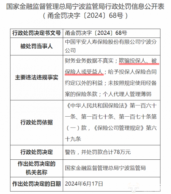 据宁波监管局2024年6月21日发布的行政处罚信息公开表显示,平安人寿宁波分公司曾因“财务业务数据不真实;欺骗投保人、被保险人或受益人;给予投保人保险合同约定以外的利益;未按照规定使用经备案的保险条款;个人代理人管理薄弱”等行为,被警告并处罚款合计78万元。