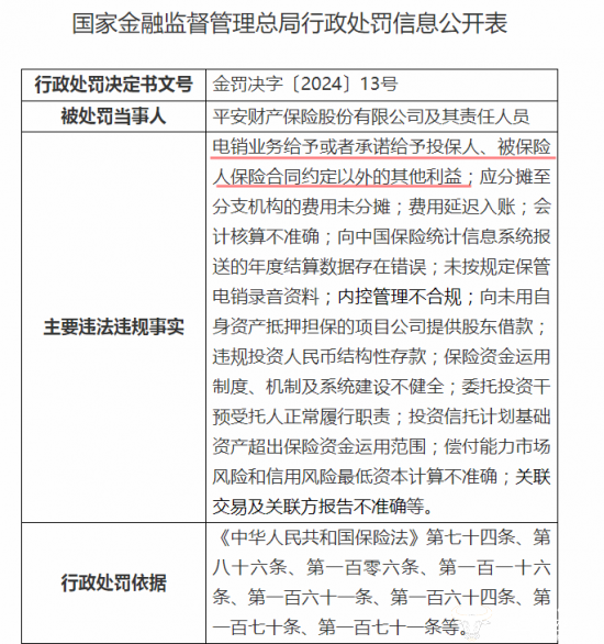 据国家金融监管总局于2024年5月17日发布的行政处罚信息显示,平安财险因存在“电销业务给予或者承诺给予投保人、被保险人保险合同约定以外的其他利益;应分摊至分支机构的费用未分摊;费用延迟入账;会计核算不准确;向中国保险统计信息系统报送的年度结算数据存在错误;未按规定保管电销录音资料;内控管理不合规;向未用自身资产抵押担保的项目公司提供股东借款;违规投资人民币结构性存款;保险资金运用制度、机制及系统建设不健全;委托投资干预受托人正常履行职责;投资信托计划基础资产超出保险资金运用范围;偿付能力市场风险和信用风险最低资本计算不准确;关联交易及关联方报告不准确”等行为,平安财险公司合计被罚款595万元,其中,总公司515万元,分支机构80万元。