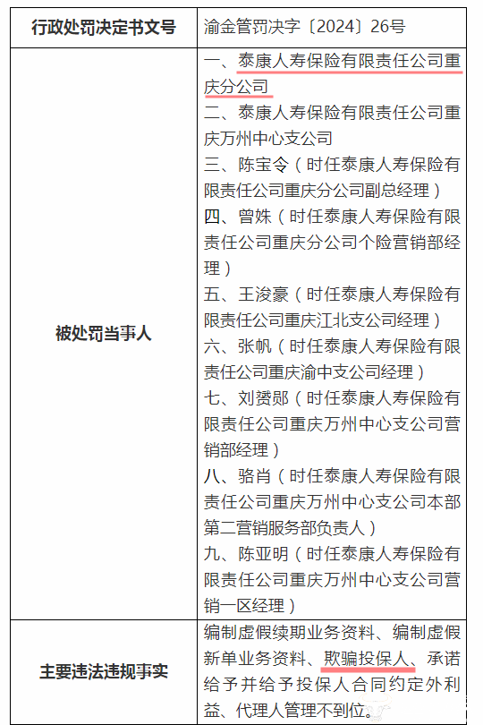 重庆监管局于2024年12月25日发布对泰康人寿重庆分公司的处罚信息,该分公司及下属重庆万州中心支公司,存在“编制虚假续期业务资料、编制虚假新单业务资料、欺骗投保人、承诺给予并给予投保人合同约定外利益、代理人管理不到位”等行为。对此,泰康人寿重庆分公司被罚款125万元,下属重庆万州中心支公司被罚款11万元,另有多位相关人员被罚。