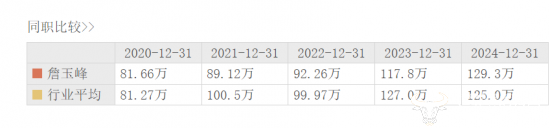 在此背景下,副总经理詹玉峰2024年薪酬为129.3万元,较上一年度增加11.5万元,在五位副总中,唯一薪酬上涨者,另四位副总薪酬与上一年持平。