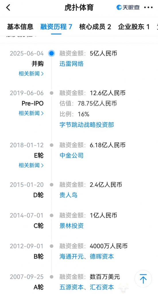据天眼查公布的融资历程可以看到,虎扑一路走来受到了不少投资者的青睐。2019年还曾获得字节跳动12.6亿元Pre-IPO轮融资,当时虎扑市值估值高达78.75亿元,同时这笔融资创下该体育社区成立以来的最大单笔融资纪录。