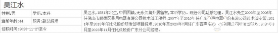 公开资料显示,吴江水,1981年出生,本科学历,具体学校和其他信息披露不多。但值得一提的是,他的职业履历很有意思。吴江水早年曾在佛山顺德星月电器担任技术工程师三年,2007年加入容声电器任技术主管。2011年,他首次加入比依股份,担任研发项目经理四年,此后又重返容声电器任研发经理四年。2020年,他再次回到比依,担任广东分公司经理,三年后升任公司副总经理至今。