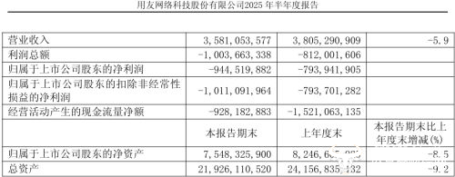 因为从用友网络发布的截止2025年上半年的财报显示,用友网络2025年上半年营收为35.81亿元,较上年同期的38亿元下降5.9%;归属于上市公司股东的净亏损为9.45亿元,上年同期的净亏损为7.94亿元。