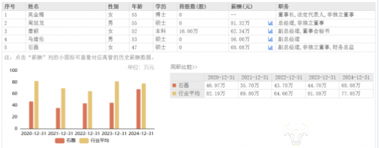 而在公司去年业绩下滑的背景下,公司高管却纷纷涨薪。石磊2024年薪酬为68.08万元,相较于2023年的44.70万元,上涨了23.38万元,是三位副总中薪酬最高的,但低于总经理周延龙。周延龙2024年薪酬为81.32万元,相较于2023年的51.50万元,增长了29.82万元,是公司涨薪最多的。