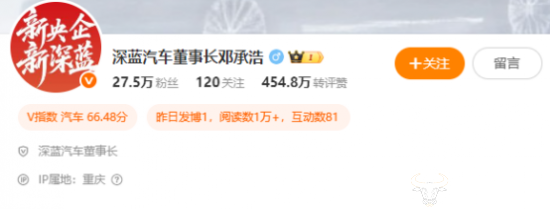 此前,深蓝汽车CEO一职由邓承浩担任,运营商财经网注意到,如今邓承浩的微博名称已变更为“深蓝汽车董事长邓承浩”,有内部人士透露,“邓承浩今年2月就已升任深蓝汽车董事长,但那时同时兼任着CEO。”