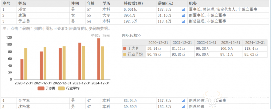 而在去年公司业绩上涨的背景下,公司高管薪酬也纷纷增长。于志勇2024年薪酬为118.4万元,相较于2023年的106.0万元,上涨了12.4万元,在三位副总经理中却仍为最低薪酬。