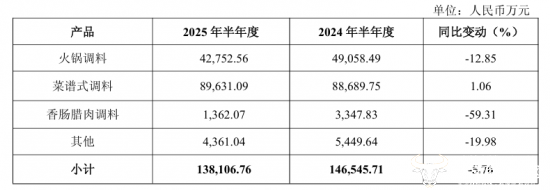 从品类来看,今年上半年,菜谱式调料产品实现营业收入8.96亿元,同比微增1.06%。而火锅调味料产品表现不佳,上半年收入为4.28亿元,同比下滑12.85%,香肠腊肉调料品类产品下滑更为显著,收入仅1362.07万元,同比降幅达59.31%。
