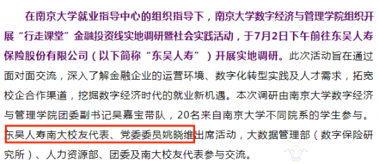 运营商财经网在梳理时发现,在近期相关报道中,姚晓维以南大校友代表的身份出现过。与此同时,近几个月东吴人寿和南京大学也多次开展了活动。虽然并不知道姚晓维在南京大学的具体就读专业,但是南京大学和东吴人寿开展的活动,让人很难不怀疑其中姚晓维发挥的作用。